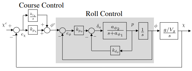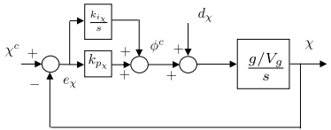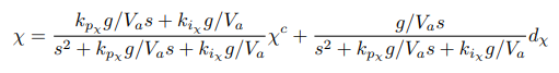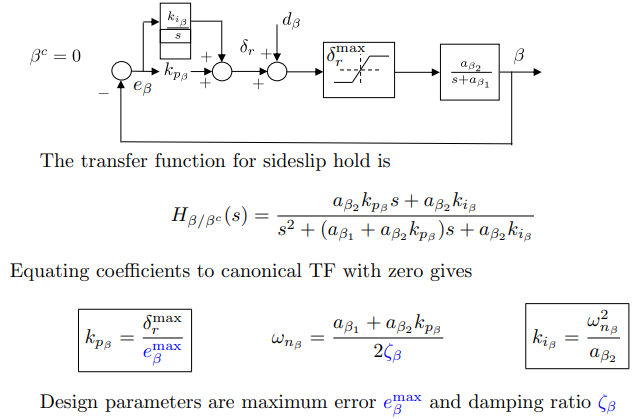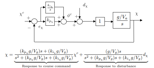 For the course loop, note the presence of the input disturbance. Using a PI controller for course, the response to the course command and disturbance is given by: