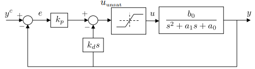 The control signal is largest immediately after a step on , at which point the output of the differentiator is essentially zeros. Therefore . Let be the input saturation limit, and , the largest expected step, then set