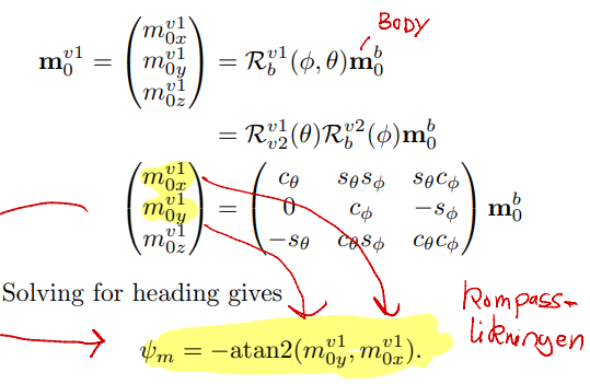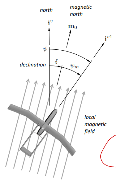 Magnetic heading determined from measurement of body-frame components of magnetic field projected onto horizontal plane