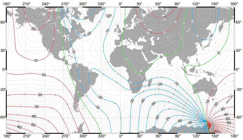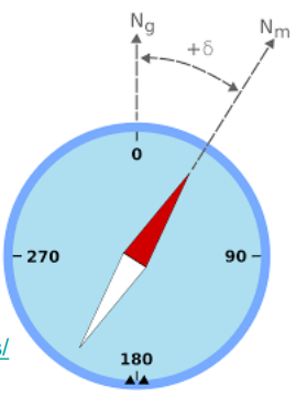 Magnetic declination or variation is the angle on the horizontal plane between magnetic North (the direction the North end of a compass needle points, corresponding to the direction of the Earthβs magnetic field lines) and true North (the direction along a meridian towards the geographic North Pole).
